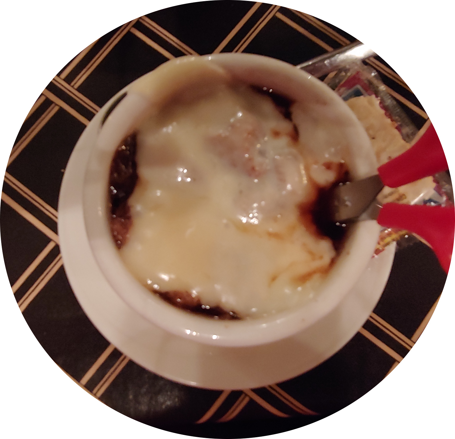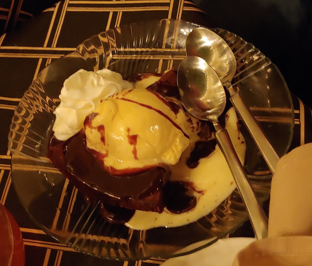 From the pot pie section of the menu, I chose the house speciality: the Conductor’s Special – Chicken Pot Pie. This was a decent pot pie but, like the onion soup, there was nothing particularly special about it. My friends went for seafood and pasta. One got the Honey Garlic Glazed Shrimp and the other got the Garlic Lovers Delight. The garlic lovers comes with your choice of meat, and she chose shrimp. Both of my friends enjoyed their meal. My friends’ daughter got a child’s portion of the pasta and meatballs. I had a taste of the meatball, and it was quite well made. A solid meatball without a lot of filler.