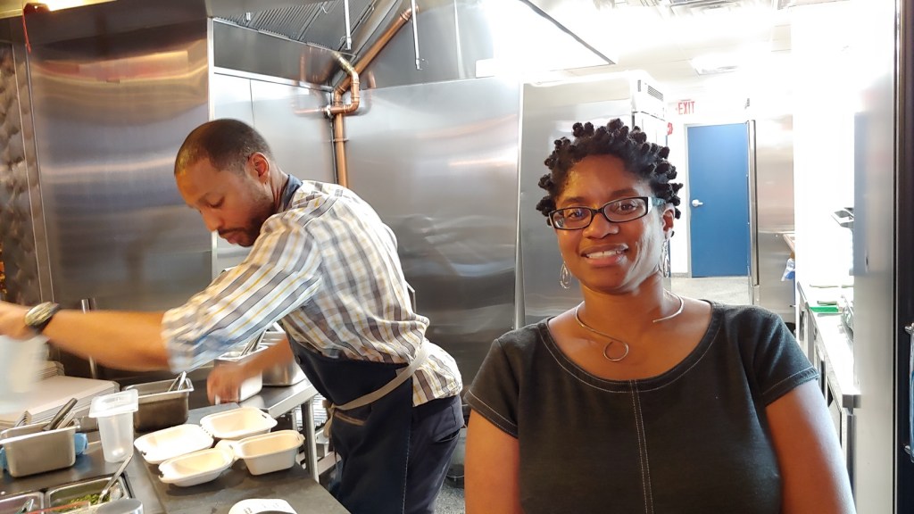 I was greeted by the co-owner, Kristal, when I came in. She enthusiastically explained the menu to me: which burgers were available, the choices of condiments, and the side dishes offered. The restaurant is a creation of her and her brother, Brendan. It’s genesis is an interesting story. Several years ago, for health reasons, their mother became a pescatarian. Brendan and Kristal were having a family Fourth of July barbecue and needed to cook something their mother could eat. They had some fish on hand, so Brendan had the idea of turning them into burgers, making them suitable for grilling. The fish burgers were such a hit that their mother almost didn’t get one! After that, Kristal and Brendan started selling the burgers at the Farmers Market by the White House. About a year ago, they opened the restaurant in Shaw.