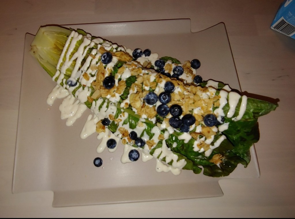 The salad came out first. It was amazing. It consisted of half a head of Romaine, lightly grilled, topped with granola and blueberries and finsied with a home made Caesar dressing drizzled all over. The combination was fantastic; the dressing to die for. That could have bee my meal right there.
