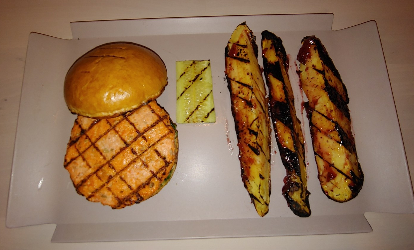 The salmon burger and the sweet potatoes came out together. The burger was advertised as containing no fillers, and they were not kidding. This is a dense, solid burger. Nothing but meat. It really is a burger made out of salmon. The condiment I chose was a spicy sambal sauce, which complemented it perfectly. The sweet potatoes were also grilled, served with a Japnese umami plum sauce. Soft on the inside, crispy on the outside, with enough suace to give it flavor but not overpower it, the sweet potatoes made for a great side.