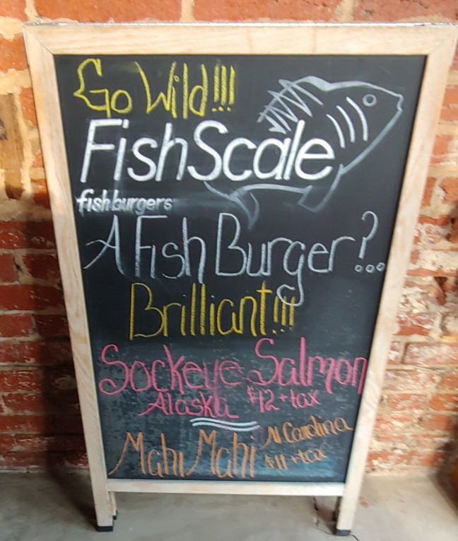 I recently found a great restaurant in the Shaw neighborhood of DC that specializes in fish burgers. “A burger made out of fish? Brilliant” goes FishScale‘s slogan. And these are not ordinary fish, either. They are sustainable, wild caught fish. As a consequence, the type of fish served on any given day varies, and they can and do sell out.