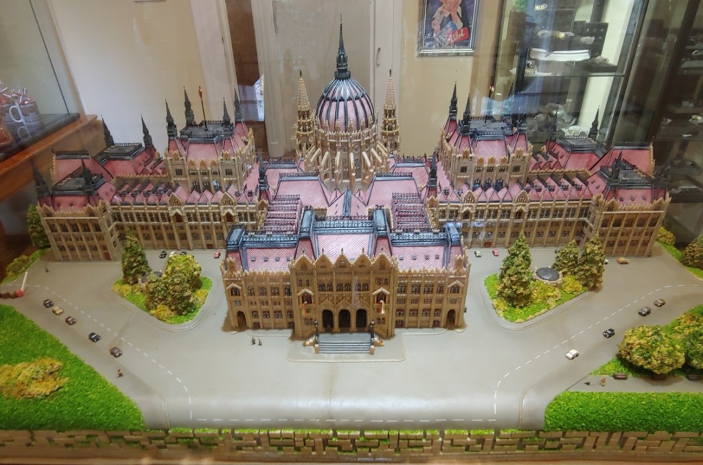 The museum itself is an ode to the history of chocolate, from pre-Columbian times, through European discovery and spread, to commercial popularization and modern production. The highlights of the museum are beautiful moulded statuary made out of marzipan (a confection made from almond butter). The photo shows a model of the Parliament building, but there is also a statue of a young lady and a reproduction of the Hungarian crown and scepter. Marzipan candies is what made the family famous.