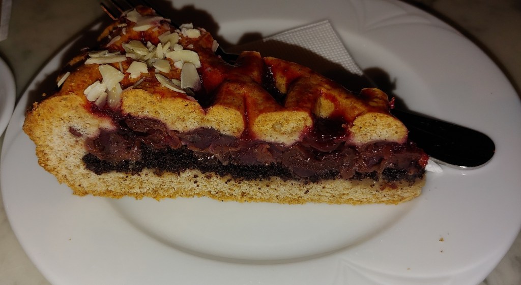 On my visit to the Szent István location, I had the sour cherry and poppy seed crepe. This was not a little bit of poppy seeds sprinkled on top. This was a sea of poppy seeds grounded into a sweet sauce. This complimented the sour cherries quite nicely, and made for a great dish.