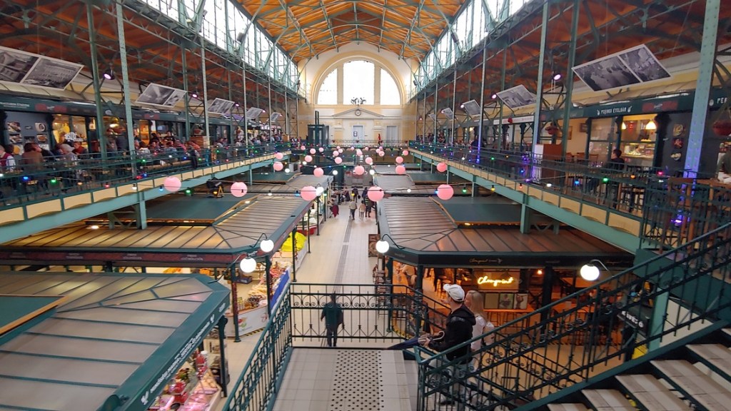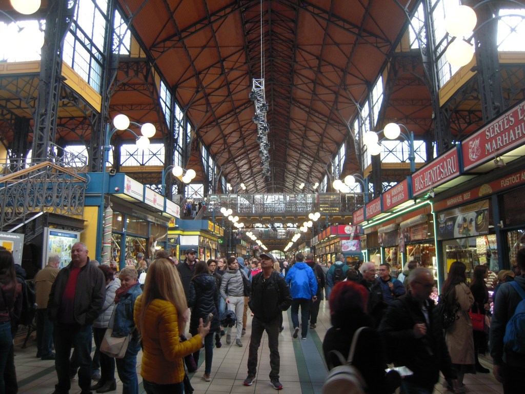 There are many fine restaurants in the Central Market. But I ended up eating elsewhere, at the Mercado Belvarosi (Downtown market). It is right next to Kispiac Bistro on Hold utca. The place I intended to eat at, the Stand25 Bisztro, did not have any seats available. It is run by a Michelin starred chef so that was not too surprising. I ate at one of the many restaurants on the upper balcony, overlooking and ringing the main hall. Many cuisines are available from traditional Hungarian, Russian, and even Asian noodles. I went with traditional Hungarian, getting a wiener schnitzel with a side of red cabbage. Quite heavy, but delicious. My companion got a big bowl of borscht from the Russian place.
