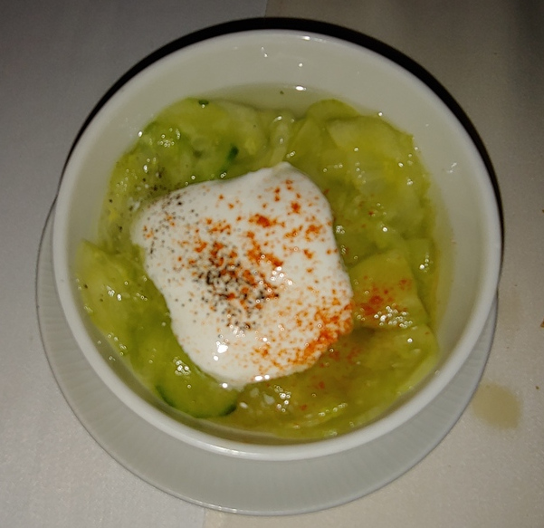 For my appetizer, I had the apple soup. Cold fruit soups are common in Hungary, but this was the first time I had one made with apples. The tartness of the apple complimented the creaminess of the soup very well.