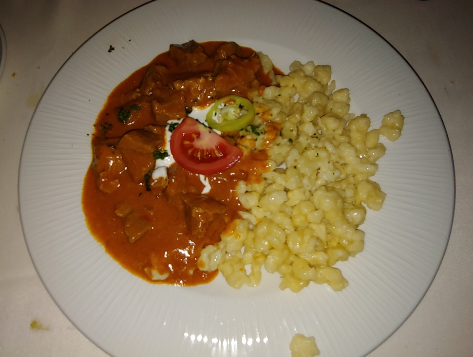 My favorite meal around Lake Balaton was on its far western shore, in the town of Keszthely. There, on a spacious patio, we ate at the restaurant Halászcsárda. This a surf and turf style restaurant with a wide variety of options available. I had the wild boar ragout, which was akin to a small stew. One of my friends had the fish soup. He quite enjoyed it, reporting that the soup had huge chunks of fish and was so thick, it was almost a stew. Another had the chicken breast. Two of my friends split a meat platter. This contained a whole duck, chicken breast, eggs, rice, bacon, stuffed pork chops, and cabbage. Remarkably, none of the meat was overcooked. Everything was moist and succulent. It was too much food for the two of them, and they ended up sharing it.