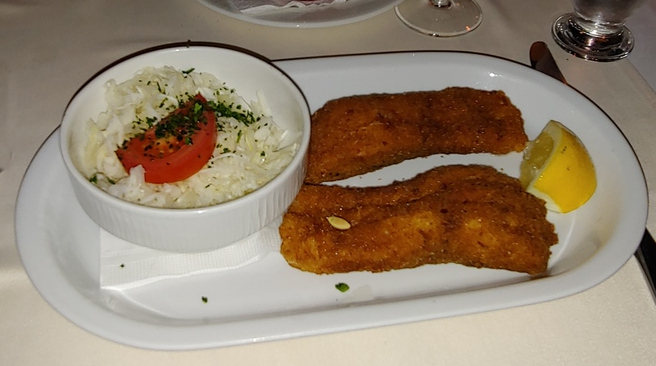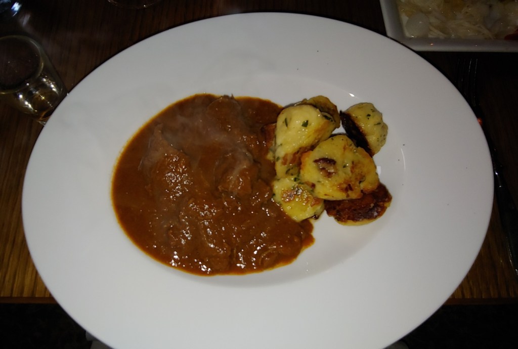 For my main meal, I had a side of cucumber salad along with goulash and spaetzle. I’m not sure if that is the Hungarian word for it, and the English menu just had a description of the dish. But spaetzle accurately describes what it is. Both the goulash and the spaetzle were quite good, although I think the bone marrow stole the show. My friend had fried fish as his meal.