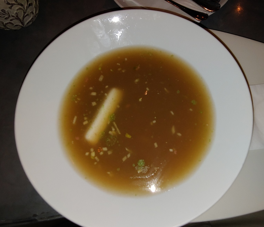 I started the meal with an appetizer of bone marrow. I was expecting to get a tiny piece of bone with a little marrow. Not in Hungary! I was served a whole shank that was completely filled with marrow, along with a plate of toast to eat it with. Words cannot describe how delicious this was! I thoroughly enjoyed it! For their appetizers, my friends both had the goulash soup.