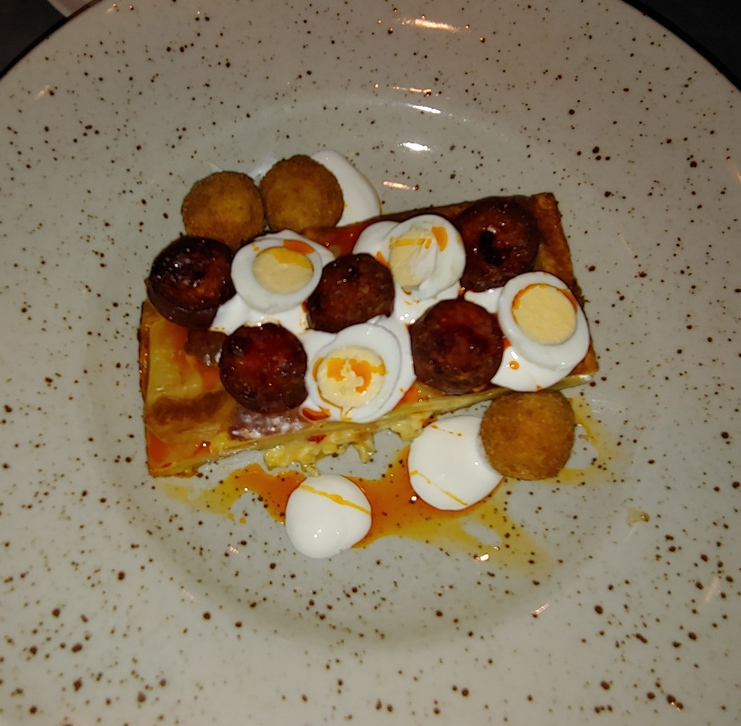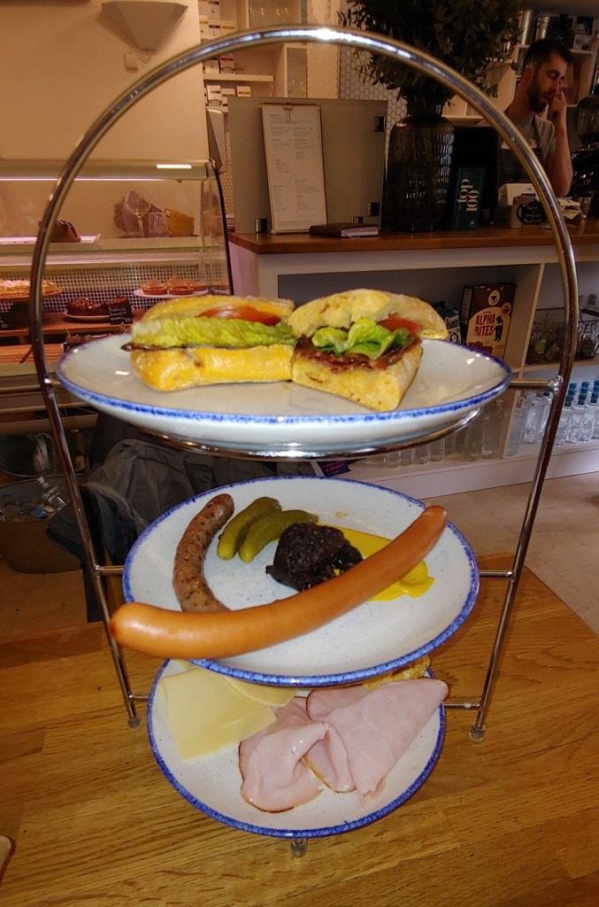 But it is worth the wait. We were there on Sunday, and so had the choice of several lunch platters. My companions had the Meet Me On Sunday, a meat heavy platter with several different kinds of sausages (including blood pudding), an omelet, cheese and ham slices, and to top it off a BLT. They both liked this very much, although they had difficulty finishing it. I went with the much lighter French Kiss which consisted of a croissant, liverwurst, apricots, and some condiments. While quite good, this turned out to be too light so I ordered a dessert. I don’t know what it was called, but it was similar to a pound cake and hit the spot.