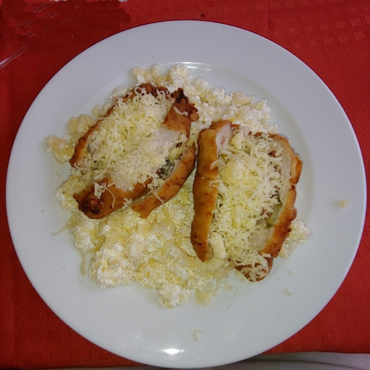 For entrées, my friends had the catfish and the pork with rice. I had the stuffed pork chop. This came with two, although I later found out I could have gotten a half sized portion with just one. The sides were cabbage salad, “golden noodles” (another name for spaetzel?), and pickles. My friend declared his pickles “cool and refreshing on a summer day.” Everything was delicious and quite filling.
