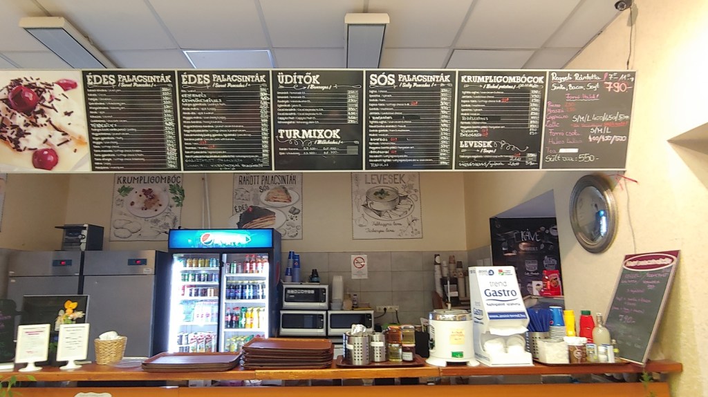Fast food crepes? Not only is there a restaurant that serves them 24×7, but it is a chain. I went to two of Nagyi Palacsintázója ‘s (Grandma’s Crepes) locations: the one on Szent István krt. near Nyugati Pályaudvar and the one on Batthyány tér . Both had good crepes, although the one at Batthyány tér was the most scenic of the two, having beautiful wooden tables, an atrium with a circular stair, and a window overlooking the plaza.