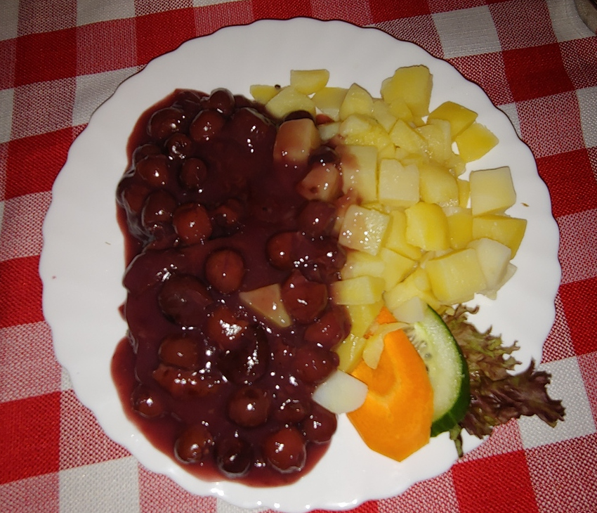 For my entree, I had a potato casserole. The portion size was not large, but it was quite dense and filling. My friends had the duck, which looked divine, and a hamburger.