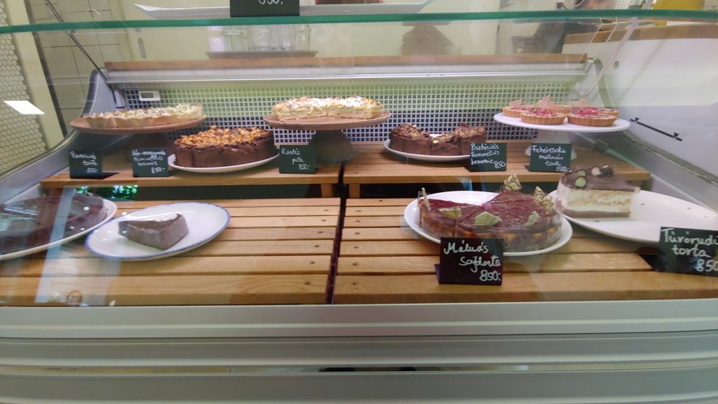 One morning, after running an errand, we stopped at a lovely little café called Kristaly Cukraszda, which can be found on József krt just a couple of blocks from the Applied Technology Museum. I’m not sure if Kristaly is a chain or not, as we did come across other cafés called Crystal in our travels. The decor was quite different, so I think Kritaly is not connected to the chain. Regardless, Kristaly is a delightful place to have a relaxed cup of coffee (or, in my case, tea) and some pastries.
