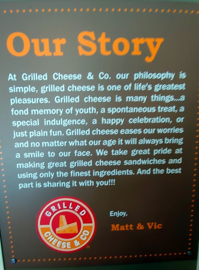 Grilled Cheese and Co is the brainchild of Vic Corbi and Matt Lancelotta. The first location opened in April, 2010, but its beginning goes back years earlier. It started with a dream Vic had on August 19, 2005. He dreamed that he was selling grilled cheese out of an Airstream on a street corner. While that particular vision did not come to pass, he did continued to pursue his goal of serving comfort food. Around 2009, Vic started selling grilled cheese sandwiches at the Wine in the Woods festival in Columbia, Maryland. That was successful enough for him and Matt to open a restaurant in Cantonsville. The rest is history. They now have 3 locations in the Baltimore area. I went to their original.