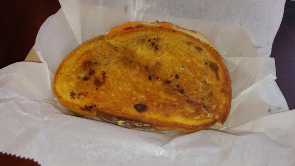 Their sandwich menu contains a variety of grilled cheese sandwiches. First, there is the classic grilled cheese. They also have a variation of the BLT which they call the BCT (bacon, cheese, and tomato). Being in Maryland they, of course, serve crab, in the Crabby Melt. Other meat themed sandwiches include Chicken BBQ, Chicken Chesapeake, and Arugula Turkey, and a Philly Cheesesteak. There are vegetarian options as well, but no vegan ones.