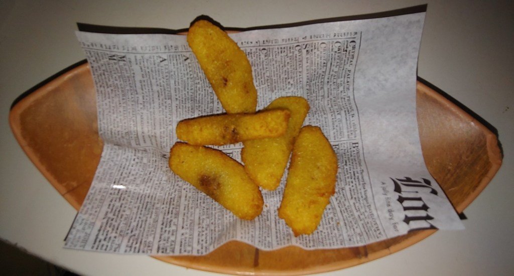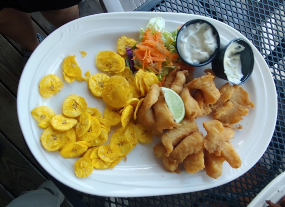 For sides, we had tostones — no meal is Puerto Rico is complete without those — and arepas. There arepas were fried, which is quite different than the Columbian arepas that I have had elsewhere. With the dipping sauce they were served with, both the tostones and the arepas they made for nice accompaniments to the fish.