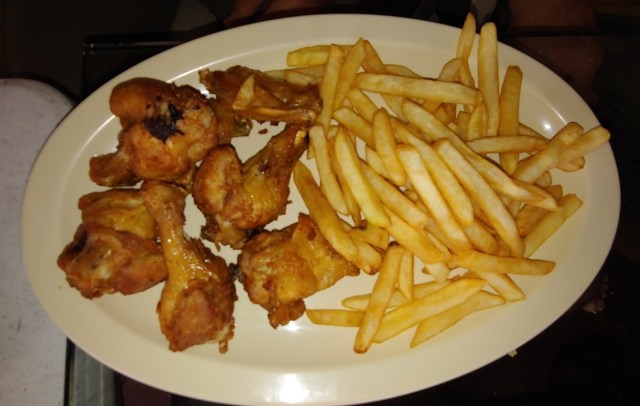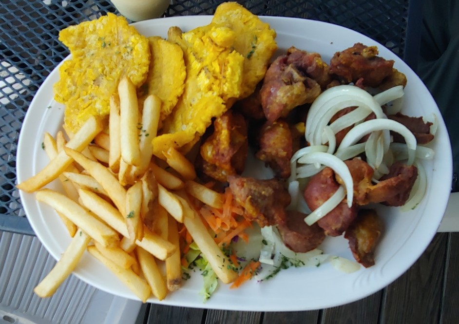 Their sign touts grilled meats and shell fish, but we went with big plates of appetizers. We ordered the sampler platter — sorullos de maiz (corn sticks), mozzarella sticks, queso frito (fried cheese) with guava sauce,grouper bites, hot wings, and tostones — along with some carne frita (fried pork). All were very good (although, since I was not in Buffalo, I skipped the wings.) The real standout dish was the queso frito with the guava sauce. The mildly sweet sauce complimented the mild cheese perfectly.