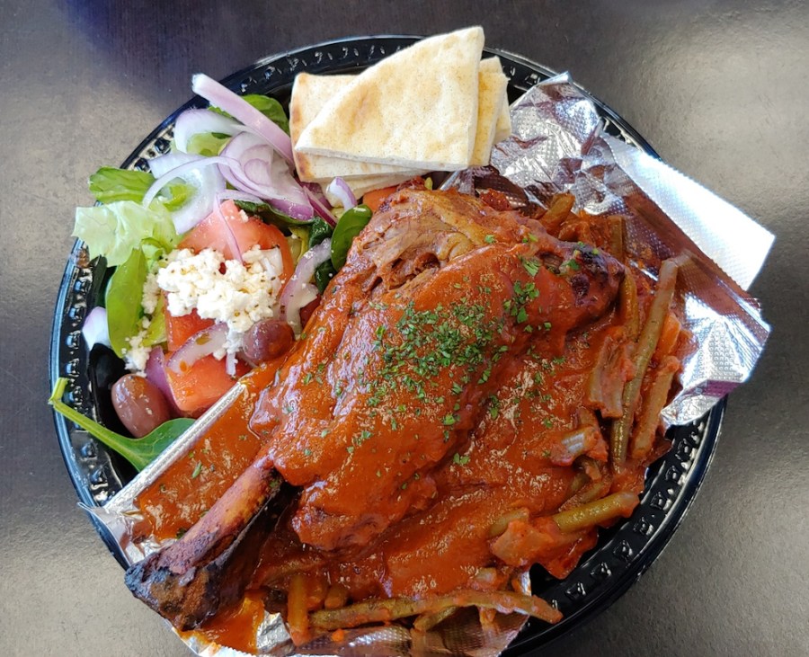 The sign on their front claims they have “The Gyros In The Area!” The gyros, which are served with a side (lettuce) salad, are good. But they are not better than Marathon’s. My favorite dish is their lamb special: a lamb shank slow cooked and served with a tomato sauce, Greek style green beans, and a lettuce salad. It is succulent.