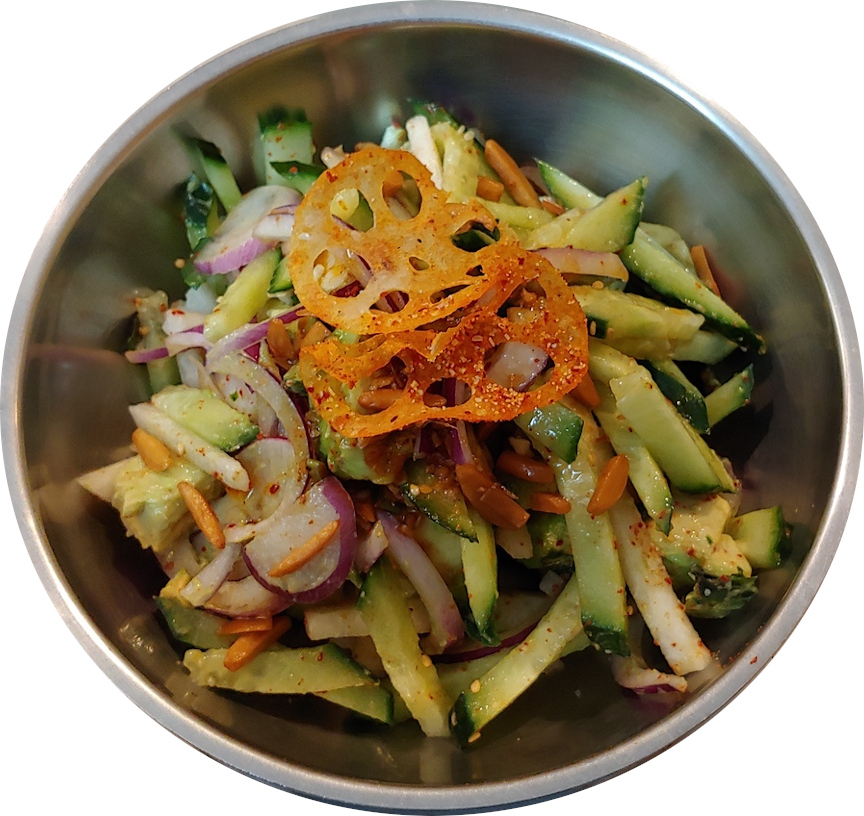 The Half-a-Cado Salad is an avocado salad. Besides avocado, it contains cucumbers, daikon (a giant but mild Japanese radish), and almond slivers. The vegetables are all cut into thin slices and served with a citrus soy vinaigrette. The combination is delicious.