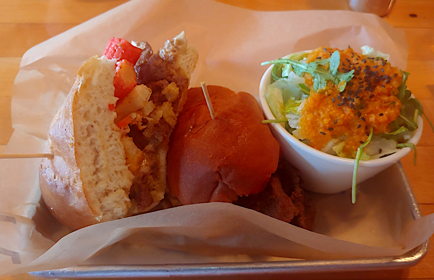 I went with the curried beef sandwich. It consists of chopped steak with a green curry sauce. Other toppings are jicama fries and pickled baby corn. I never would have thought to have put green curry on steak, but the combination is amazing!