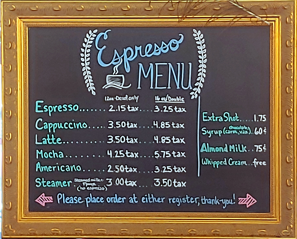Of course, it wouldn’t be a cafe without some coffee drinks. It has a small selection containing items such as Espresso, Cappuccino , and Lattes. I am not a coffee drinker, so I cannot comment on the drinks.