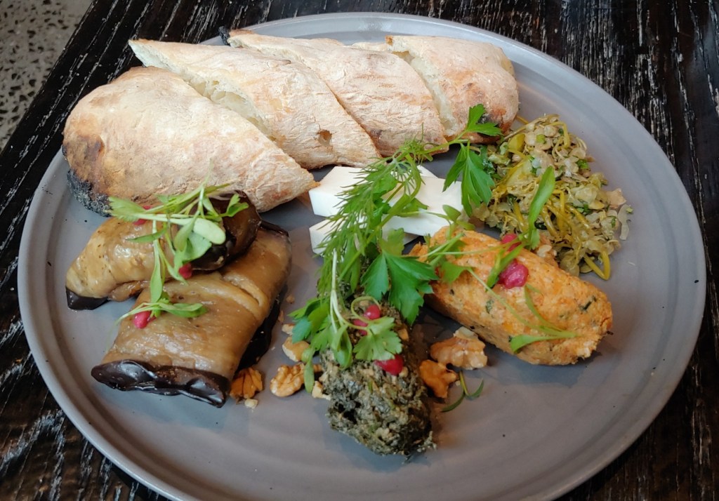 You can get a pretty good sampling with the Globi platter. This includes stuffed eggplant, a sweet and sour combination of pates (one carrot and one kale), some sort of sprout salad, bread, and cheese. My favorite was the stuffed eggplant. The filling is cheese that has been seasoned with a blend of spices. it tastes amazing. But the real star of the platter is the bread. Freshly made, crunchy on the outside but moist on the inside, it is excellent. It went well with the pates. Both have strong flavors and as such are best used sparingly. When that is done, they are well complemented with the smokey flavor of the bread.