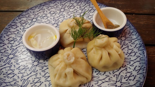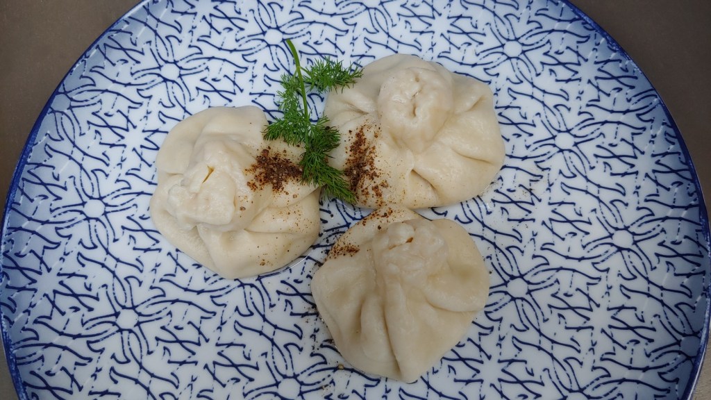 The second dish Supra is famous for is Khinkali, a Georgian steamed dumpling. Filling options are pork and beef, lamb, or zucchini and cheese. I went with pork and beef. The dumplings are filled with a flavorful broth, making them quite soupy. I had to get advice from the waiter on how to eat them. He told me to use the knot at the top as a handle, invert the Khinkali, bite into it, and suck to get the juice out. The rest is eaten at leisure. Optional is a powdered spice, served on the side. A small bowl of lemon water is used to clean your fingertips after eating. I found the Khinkali delicious, having a strong, distinctive flavor. They are also large and filling. A couple of these could make a meal. Again, I think Khinkali is best for sharing. They are also available frozen, so you can take some home.