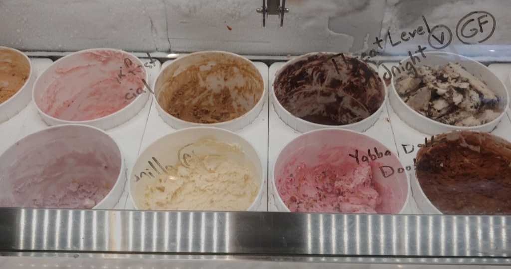 My companion went with a cup. She also had the Bada Bing, but her second scoop was Threat Level Midnight. This is a dairy free vegan ice cream made with oatmeal. Consisting of dark chocolate and dutch cocoa, it is quite decadent. She described it as practically a fudge. We loved it. But we felt it need something lighter to cut the richness. Cool Whip would do the job. Or vanilla ice cream, if you don’t need to be strictly vegan.