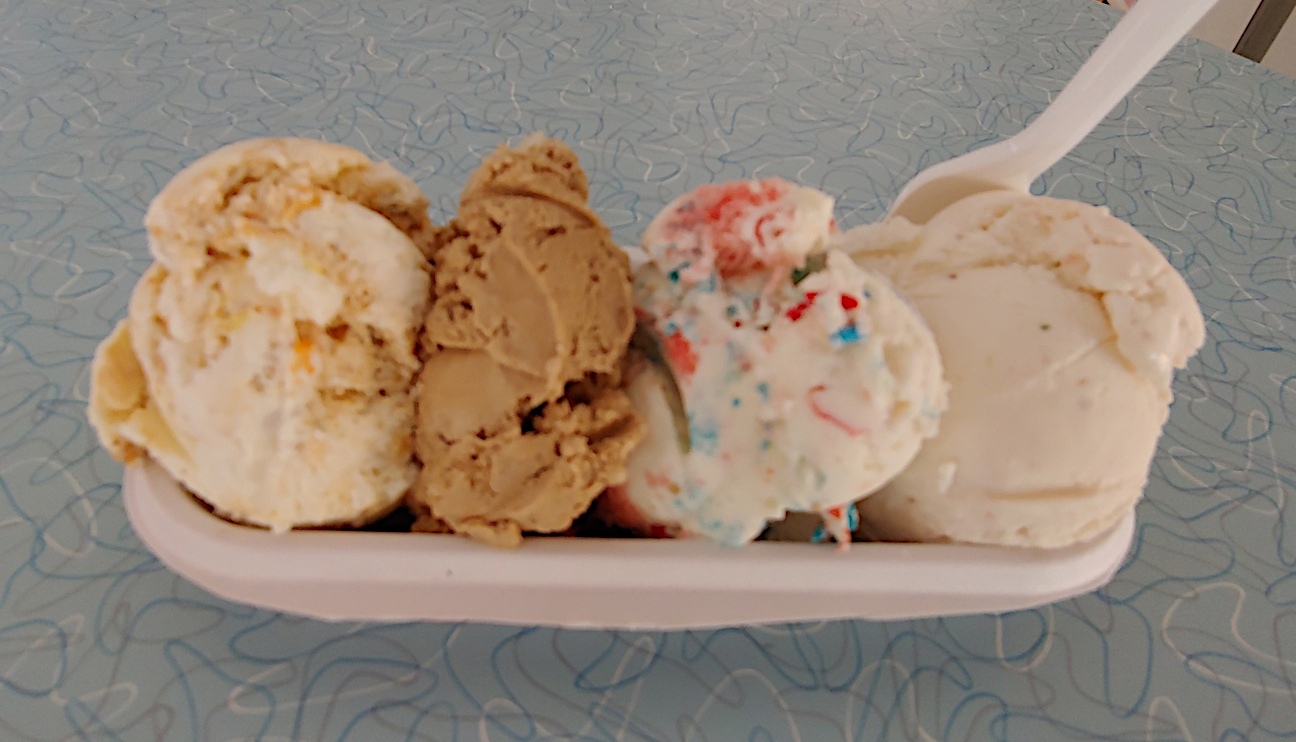 One of the nice things about Main Street is that you can get a sampler containing 4 small scoops. From right to left, they are: Strawberry Rhubarb, Fourth of July, Salty Carmel Espresso Crunch, and Peanut Butter Paradise. It’s been a few years, but my recollection was that they were fantastic. The small cone was given to us for free. It was Brownie Mudslide Pretzel.