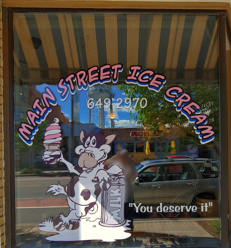 Main Street Ice Cream has a wonderful ambience. The place the feel of an old fashioned ice cream shoppe, and the servers are friendly and helpful. The photos decorating the walls show black and white images of milk trucks and dairy farms, adding to the old-time feel.
