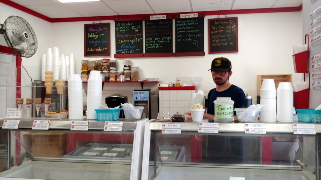 Sweet Jenny’s makes their own ice cream, with over 30 flavors to choose from. Notable flavors include Chai, Creamsicle, Butterfinger, and Snickers. Unfortunately, I did not write down what flavor I got the day I went, and it has been long enough since that I don’t remember what it was. I do recall liking it. My companion also enjoyed his sundae