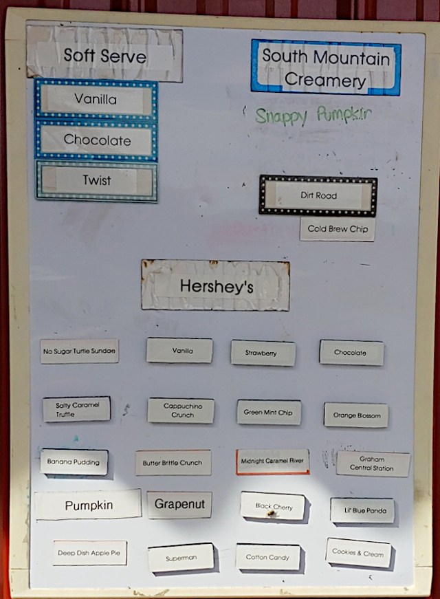 But we were there for ice cream. Little Red Barn has two kinds.: South Mountain and Hershey’s. As we were on our way to South Mountain, my companion and I decided to get Hershey’s. As Hershey Pennsylvania is not that far across the border, it is still a somewhat local product. Little Red Barn has 20 flavors of Hershey to choose from. Notable items are Graham Central Station, Butter Brittle Crunch, and Deep Dish Apple Pie.