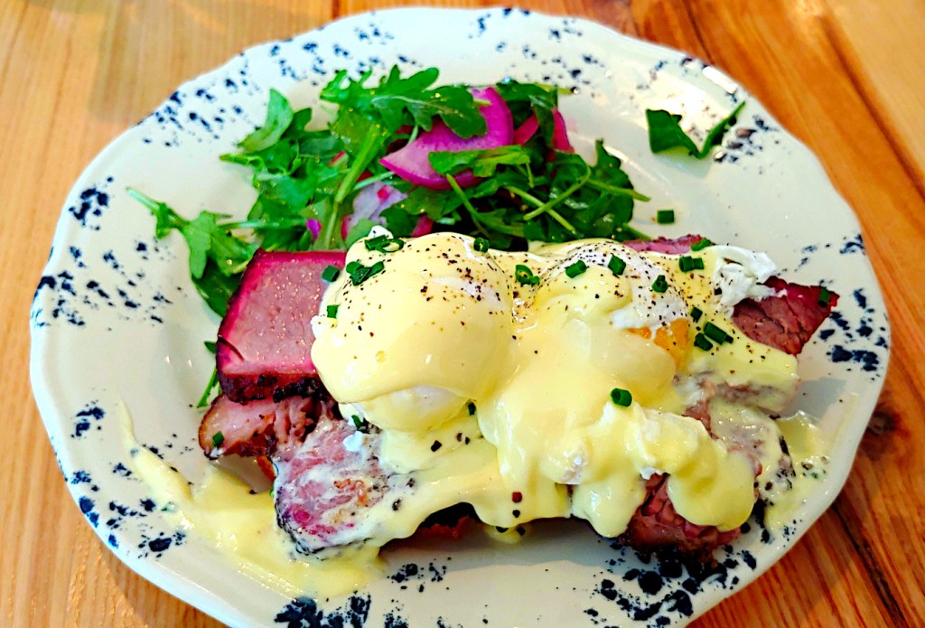 I decided on the “Brisket Bennie”, an Eggs Benedict with Brisket instead of bacon and biscuits instead of English muffins.. It is a pretty good Benedict. The brisket is very good. So is the hollandaise sauce. However, only one of my two eggs was runny. The other was over cooked. The biscuit could have been more flaky, but otherwise was tasty. The Benedict was served with a side of arugula salad and it was amazing! The salad had fresh greens with pickled red onions and a tangy vinaigrette sauce. Delicious!