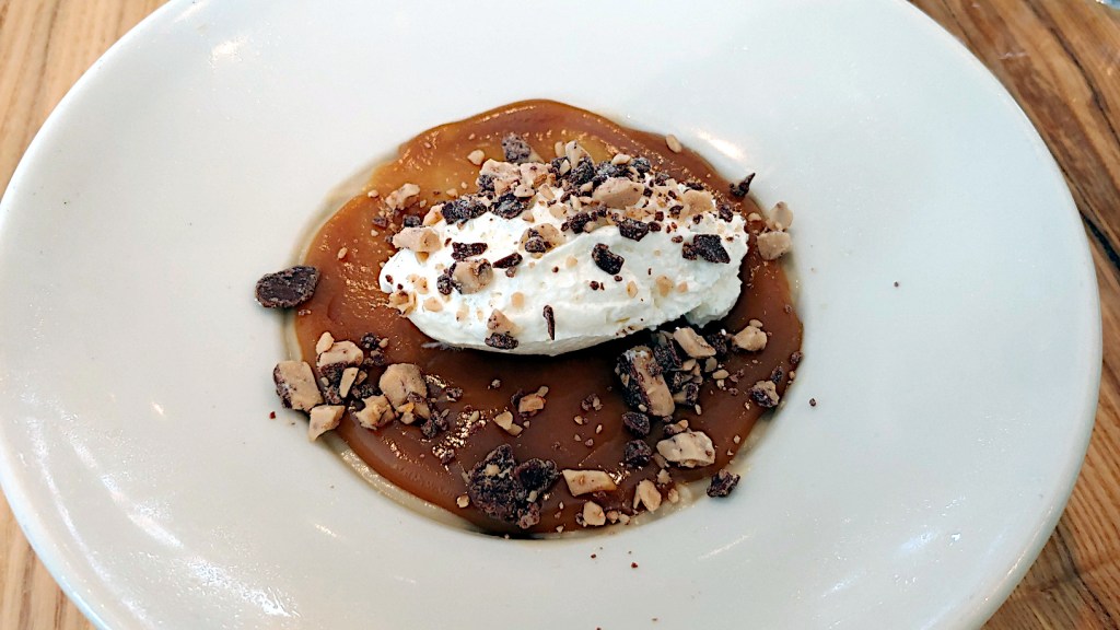 Ruthie’s brunch menu has two choices for dessert: Warm Campfire Cookies or Butterscotch Pudding. Both sounded delicious. But as I had recently done the Maryland Ice Cream Trail and the cookies were served with ice cream, I decided I wanted a dessert where it was not a major player. So Butterscotch Pudding it was. The pudding is decadent! It has a rich and strong butterscotch taste and is topped with a Chantilly cream that provides good contrast. A nice touch is crumbled heath bars on top, giving it a bit of a crunch. Just excellent!