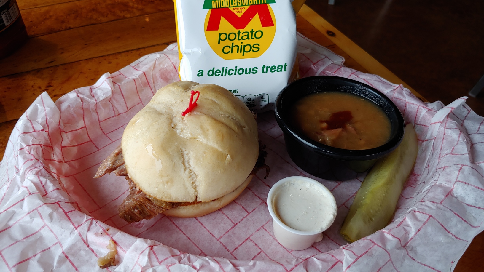 I have tried both the sandwich and the platter. I think the platter is a better deal, but I get the sandwich for a smaller meal. It’s also a good way to save space for other menu items. As the pictures show, I have had the brisket and the pulled pork. I enjoyed them both, but alas I do not have a picture of my favorite item: burnt ends. That was a special offering on one of the days I stopped by. The brisket sandwich was served with a creamy horseradish sauce. It’s tang complemented the brisket quite well.