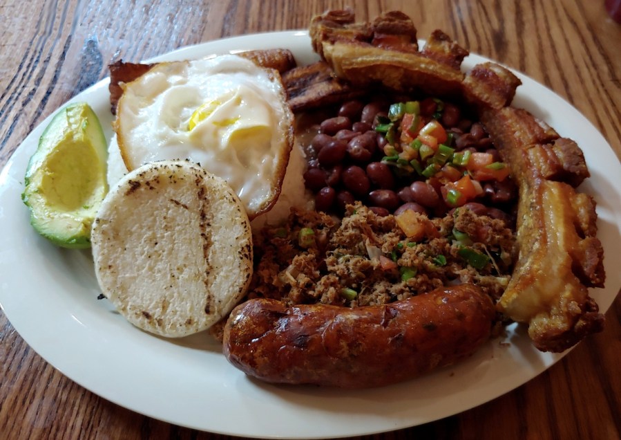 Normally, I stick to the arepas. But recently while I was there, I saw someone order an entree that had a giant slab of pork. It looked amazing. So on my next trip, I ordered a dish with it: the Bandeja Paisa, which turns out to be the unofficial national dish of Colombia. Along with the pork, it has ground beef, beans, chorizo sausage, sweet plantains, a corn cake, a mound of rice topped with a fried egg, and a half of an avocado.