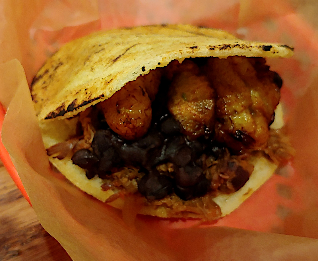 With the basket, there is a choice of shredded beef, avocado, shredded chicken, and roasted pork. My favorite is the shredded beef. It has the most flavor, probably because it has the most fat. My second favorite is the avocado, which was fresh and ripe. The one with the least flavor was the chicken. Outside of the basket, arepa choices include a vegetarian, shrimp, corn, cheese, and several variations of egg. The only one I have tried is La Pabellon. Consisting black beans, fried sweet plantain, and brimming with shredded beef, it is delicious.
