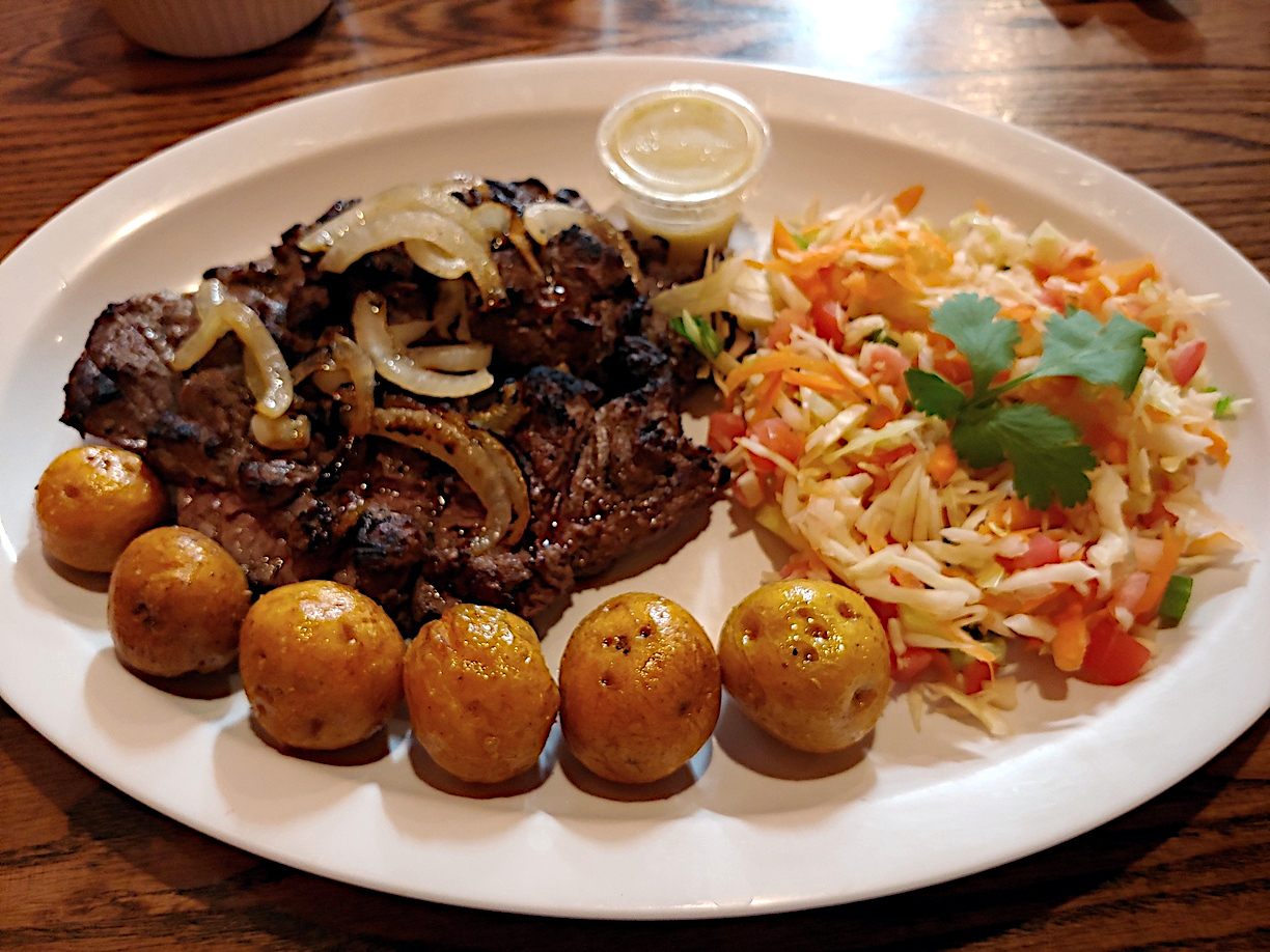 It’s quite a bit of food and I ended up saving half of it for another meal. My favorite part of the meal was the beans. It has a seasoning that I found delicious. The pork, I felt, was a little too dry despite the copious amounts of fat on it. I think the cooking method causes the parts of the meat away from the bone to dry out. Because of the dryness, I asked for some sauce and that resolved it. The rest of the meal was quite good. Other menu items feature typical Colombian soups, steak or fish entrees. The only one I have tried is the Carne Asada. A common Latino dish, carne adada is a steak pounded thin and grilled. It is typically made from a tougher cut meat tenderized by the pounding. I normally don’t order carne adada as it tends to be over cooked. But Arepas offers the choice of medium or well done. Ordering it medium has made me rethink my opinion of the dish. It was delicious.