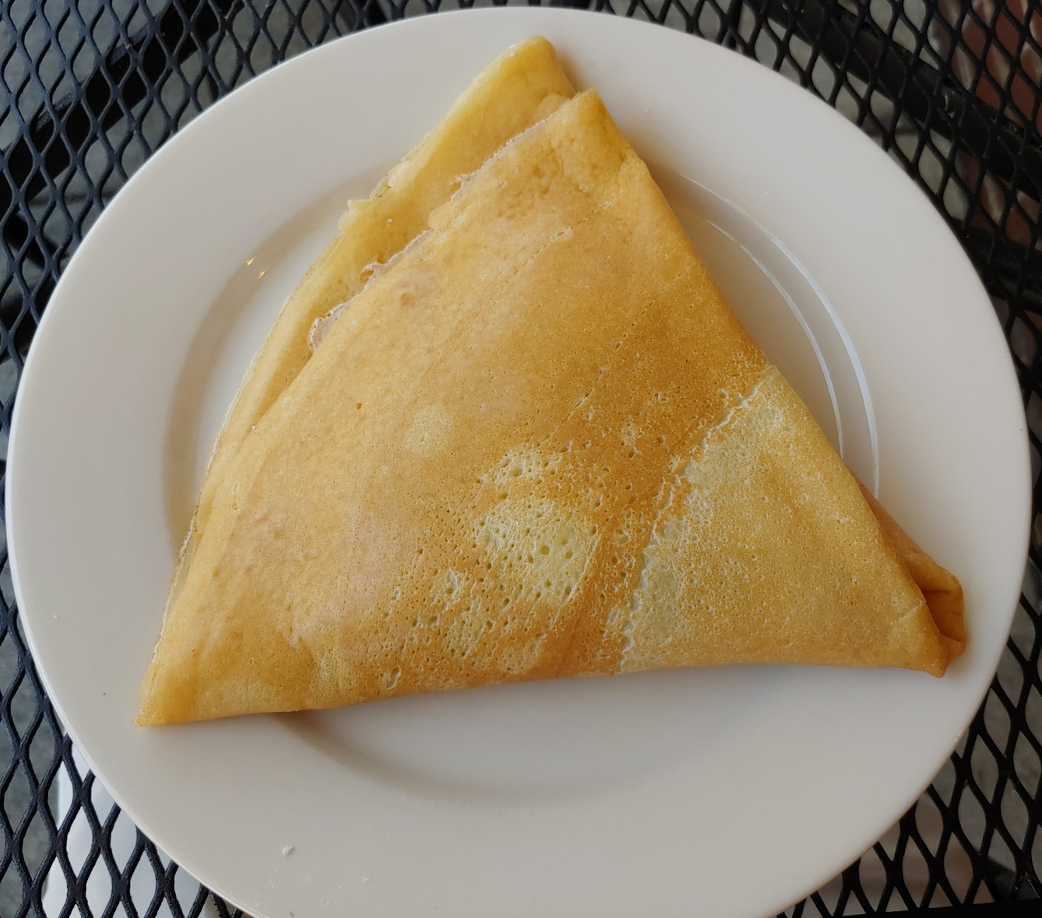 The bananas in the sweet crepe were mixed in with a brown sugar butter sauce, making for a delicious combination. I was a little surprised that the bananas, while warm, were not cooked down. I was expecting them to be sauteed. That didn’t bother me, but people with an aversion to raw bananas should be aware. The crepe is served with whipped cream, but I was not impressed. It tasted like it came from a can. Despite that reservation, I thoroughly enjoyed the crepe. I would definitely order it again.