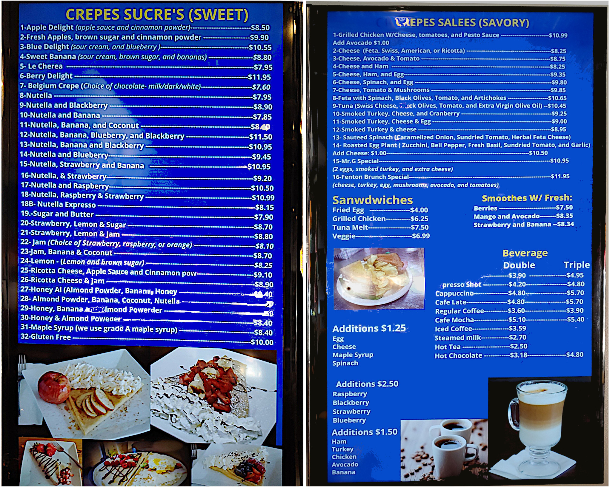 Fenton Cafe has a dizzying array of both sweet and savory crepes. There are 15 savory crepes to choose from and whopping 32 sweet ones.