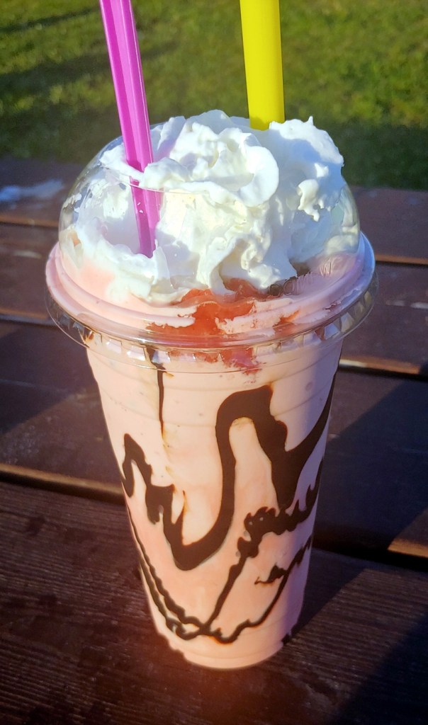 I ordered the chocolate covered strawberry sunshake. Made with strawberry ice cream with fresh strawberries mixed in, topped with Cool Whip, and absolutely dripping in a fresh hot fudge sauce, it is divine! The perfect summer shake.