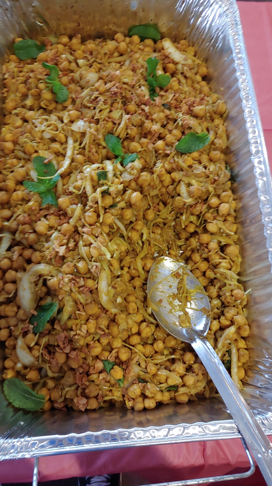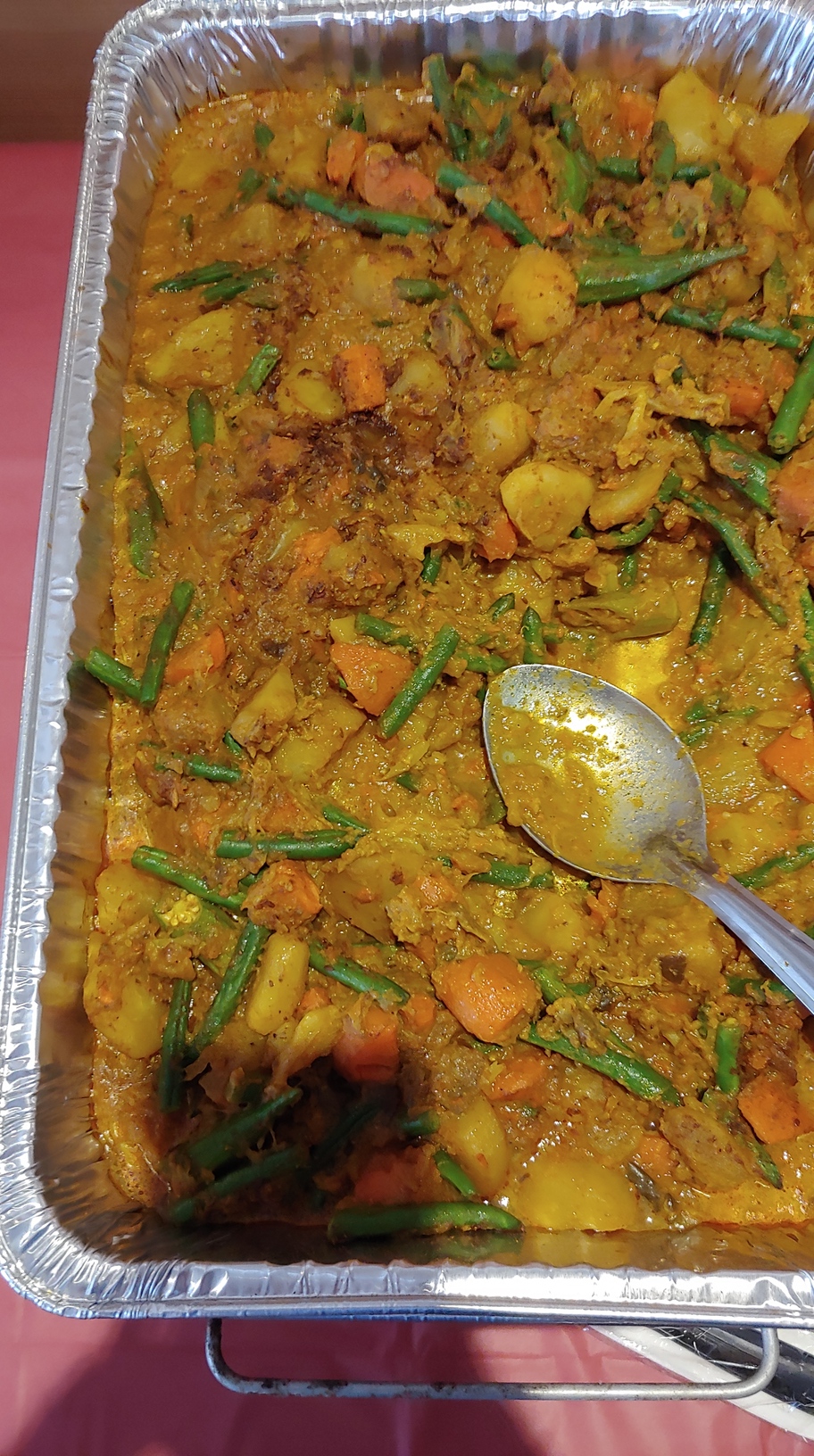The buffet had a mix of vegetarian and meat/dairy dishes. The meat dishes were chicken, curry goat, pork belly, and okra with hard boiled eggs. The vegetarian ones were butter beans, a vegetable curry, chick peas, and graham fritters.