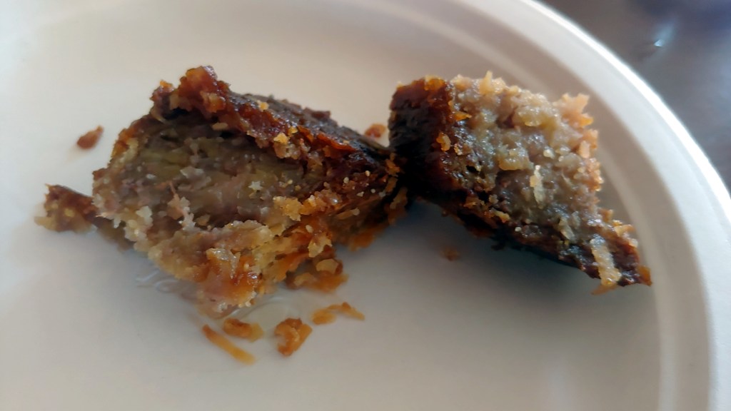 Except for the fritters, I’ve not had any of them before, but was happy to try new dishes. I’m not sure what the chicken dish was, as it was crispy, similar to pork rinds. I’m guessing it is a topping of some sort. My favorite of the meats was the curry goat. Of the vegetables, curry one was my favorite there as well. But all were very good. For dessert, there was some sort of sweet bean curd topped with coconut. It’s a typical dessert, one I’ve had before.