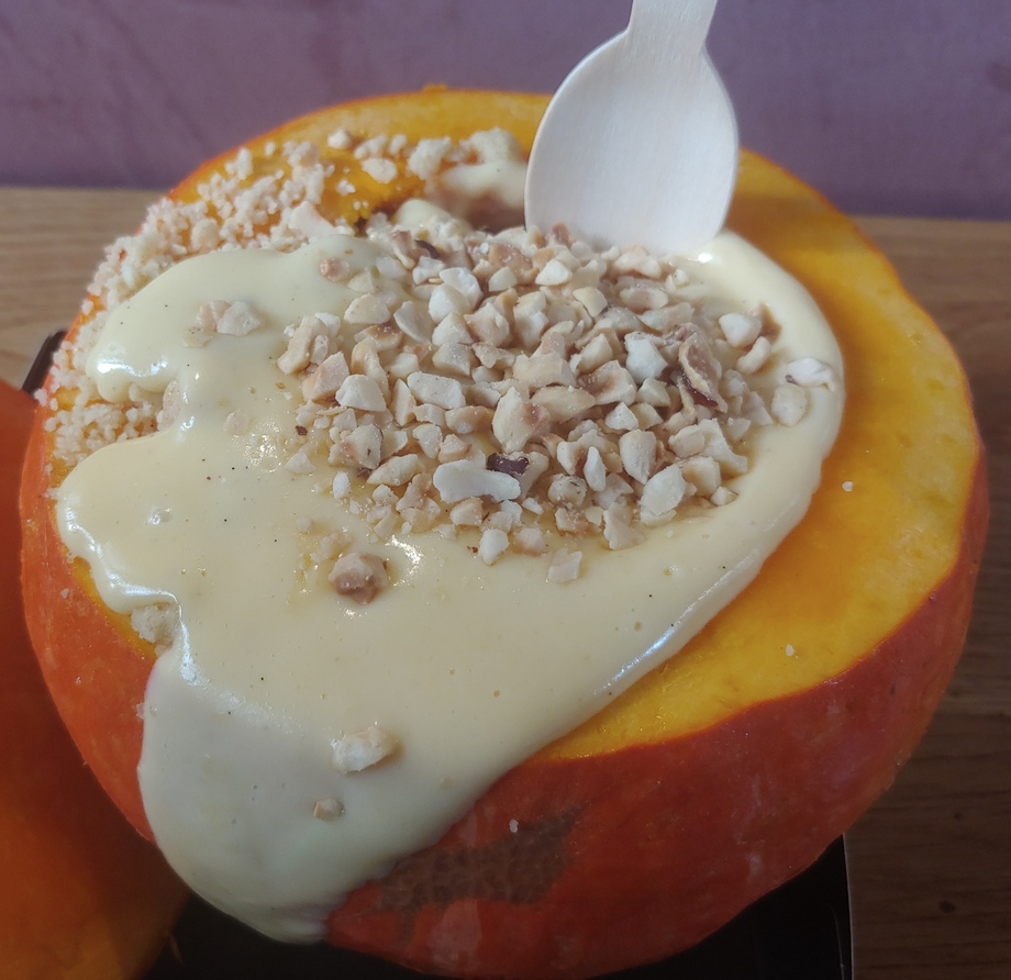 I had no idea what a crumble is, but they were advertising “Hot Apple Crumble” and had consistently long lines, so I figured it must be good. So what is a crumble? A crumble (at least, the crumble they serve) is hot fruit mixed in with short bread served in a cup and drizzled with hot custard, along with a small choice of toppings. The special of the day had it served in a pumpkin. And that is what I got.