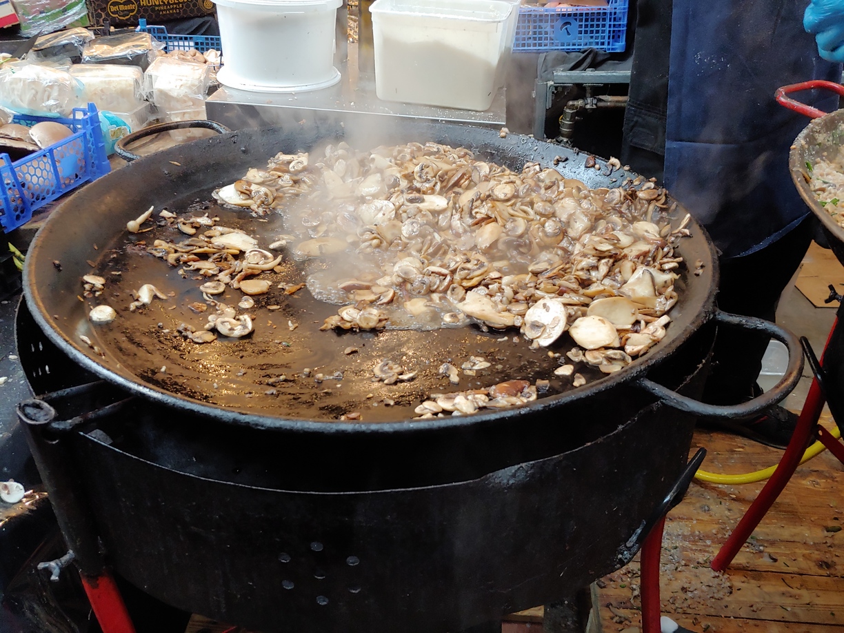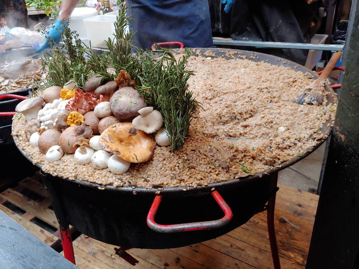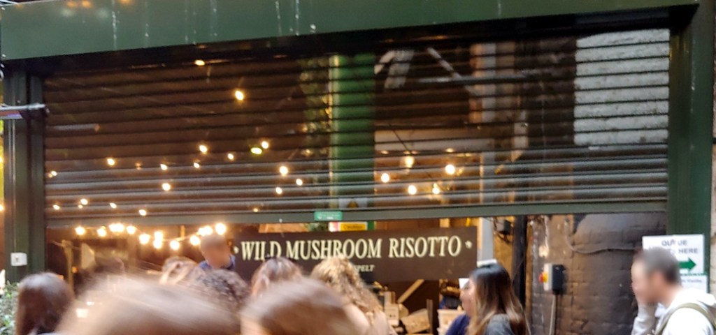 And this booth was was selling Wild Mushroom Risotto. I had not heard of this kind of risotto before, but it must be common in the UK because after I got back home I found a British Pub in DC that has it on the menu. The Wild Mushroom Risotto booth in Borough Market had a bit of a line but it went quickly. And while you wait, you can watch them cooking the risotto right there.