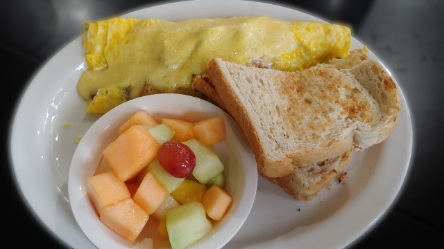 It was a tough choice, but for my entree I went with Granny’s Favorite — an omelet with turkey, bacon and vegetables, topped with hollandaise sauce. All entrees come with toast (white, rye, or sour dough) and a choice of potatoes or fruit. I went with sour dough toast and the fruit.