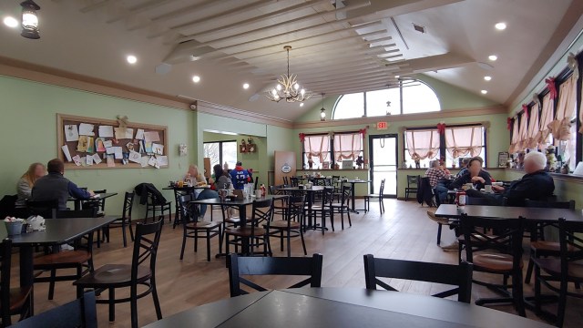 Their menu is extensive with dozens of breakfast items: eggs (with bacon sausage, or ham and in combination with other items), hotcakes (pancakes with or without fruit; there are also a couple of dessert options), omelets, flatbreads (breakfast or meat lovers), biscuits & gravy, and eggs benedict. Non-breakfast options include a variety of burgers, sandwiches (sloppy joes, chicken breast, club, or turkey), and country fried steak. And of the breakfast items can be ordered as a side. There are also lunch side dishes which include french fries, baked beans, and Campslaw. The kids’ menu has chicken fingers, grilled cheese, and kid sized breakfast items. Specialty items include the Garbage Plate (griddle toast, pancakes, potatoes, eggs, cheese, hollandaise sauce and syrup! ), Fisherman’s Favorite (omelet with shrimp, crab, spinach, and hollandaise sauce), and the Kodiak Burger (cheeseburger where the buns are grilled cheese sandwiches!).