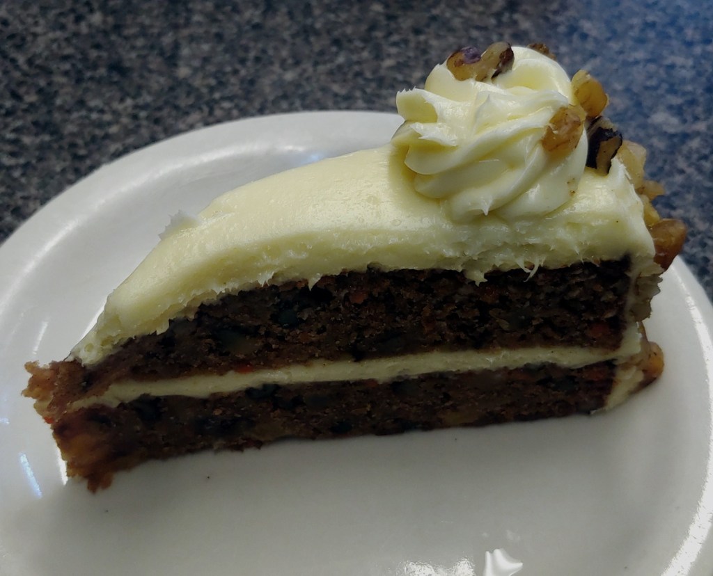 Mark’s Kitchen also has desserts. It being so close to closing, the options were a bit limited. With a choice of pies or carrot cake, I chose carrot cake. It wasn’t as dense as a lot of carrot cakes, but it was quite tasty. I liked that it had a lot of walnuts, big chunks of walnuts. Even the walnuts on the frosting were large, providing a nice crunch. I also liked the cream cheese frosting; it was soft and not overly sweet. All in all, a very nice cake.