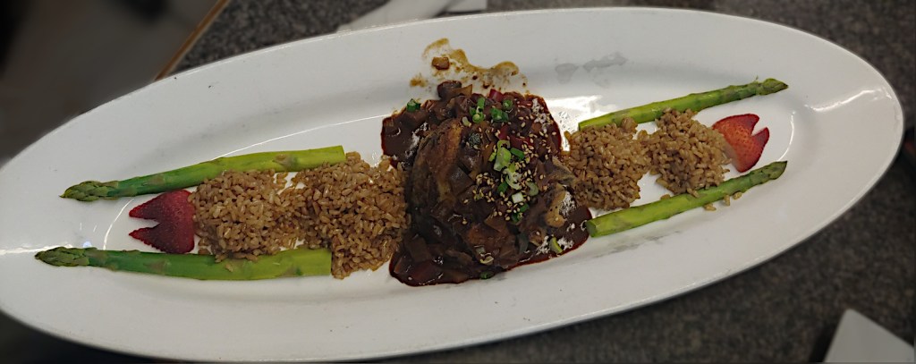 A vegetarian dish, it consists of layers of tofu, shiitake mushroom, eggplant, Asian radish, and red pepper, all covered in an unique Asian sauce. Accompaniments are brown rice and asparagus. The presentation is stunning, with the vegetable pagoda centered in a large, elongated plate with small mounds of rice going outwards, flanked by spears of asparagus. And the dish did not disappoint. The layers of vegetables are quite substantial, with the sauce and its strong notes of soy complementing it quite well.