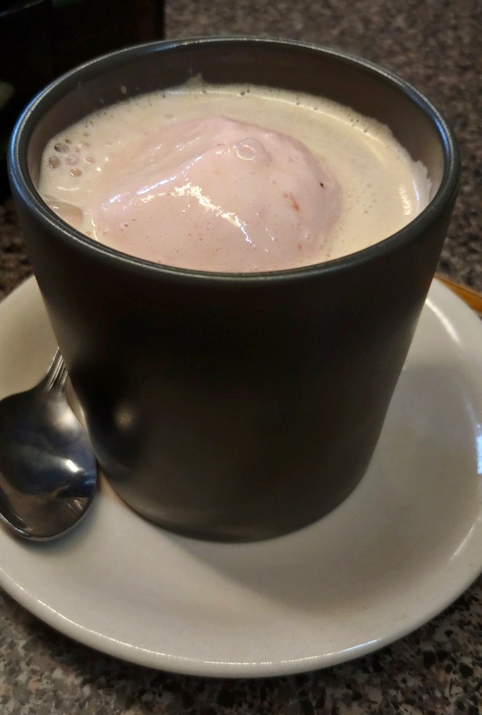 Along with my meal, I had a cup of barley tea. Hot, caffeine free, and having a dark, deep flavor, it is a great drink to warm you up during the winter. But not everyone at my table avoided caffeine. A companion got the Viennese coffee, which at Mark’s is served with ice cream (strawberry was all they had). Surprised by the combination, my friend found it a nice treat.